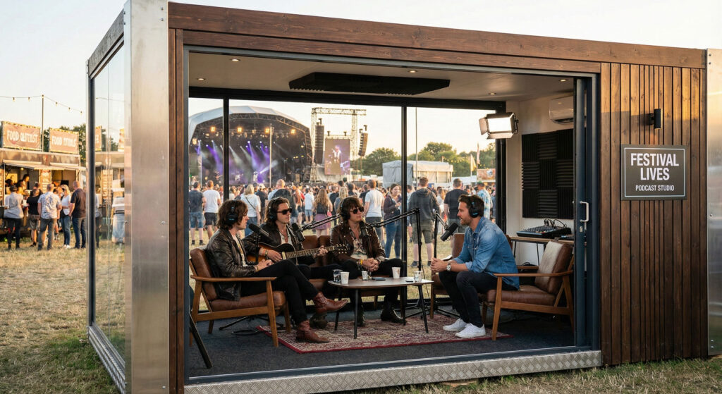 For multi-day or touring events, Fabox™ modular structures are particularly effective, providing enclosed, repeatable podcast studios or interview rooms that can be deployed quickly, branded cleanly and reused across locations.
