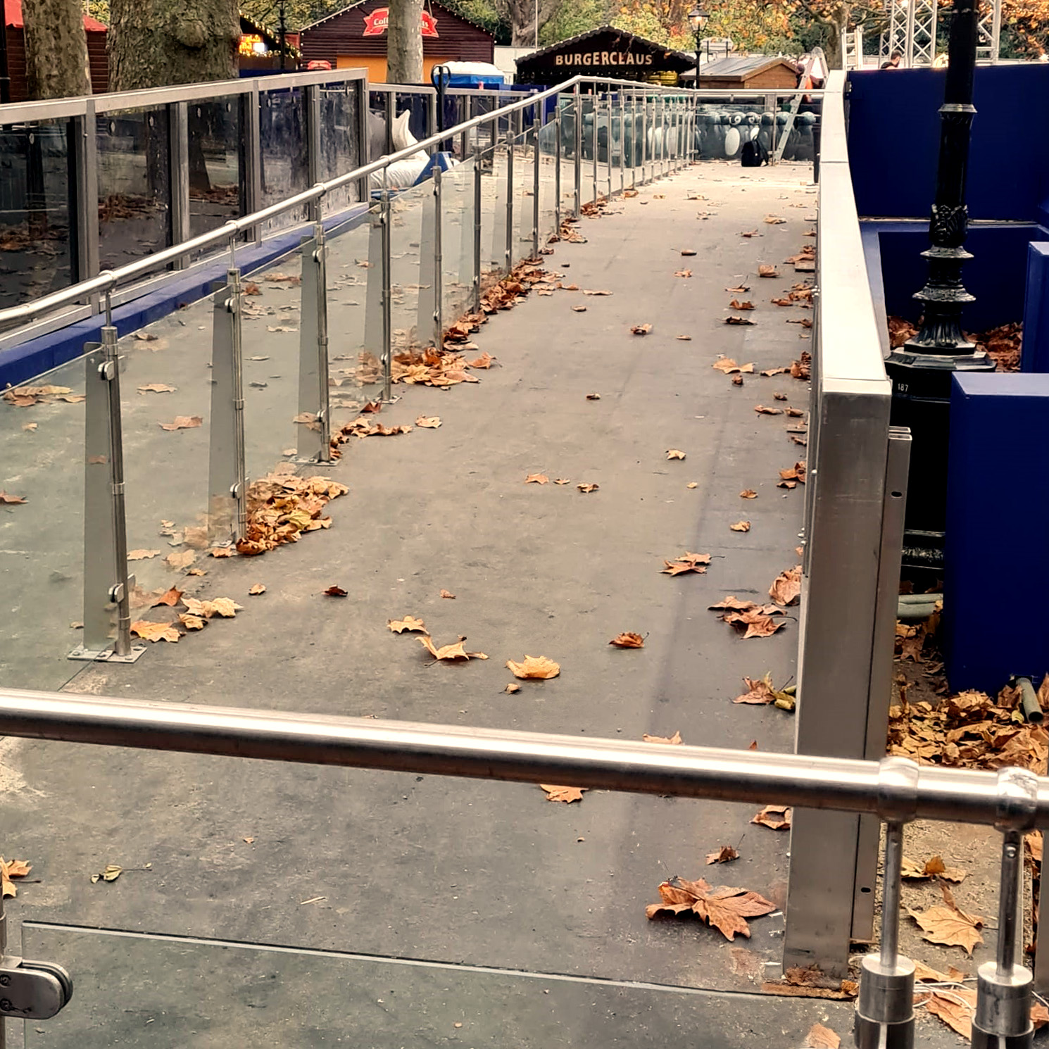 From illuminated forest paths to busy rink entrances, we supply access systems that prioritise safety and flow. Choose from key clamp, timber, or glass handrails, with slip-resistant surfaces and compliant gradients built to current standards.