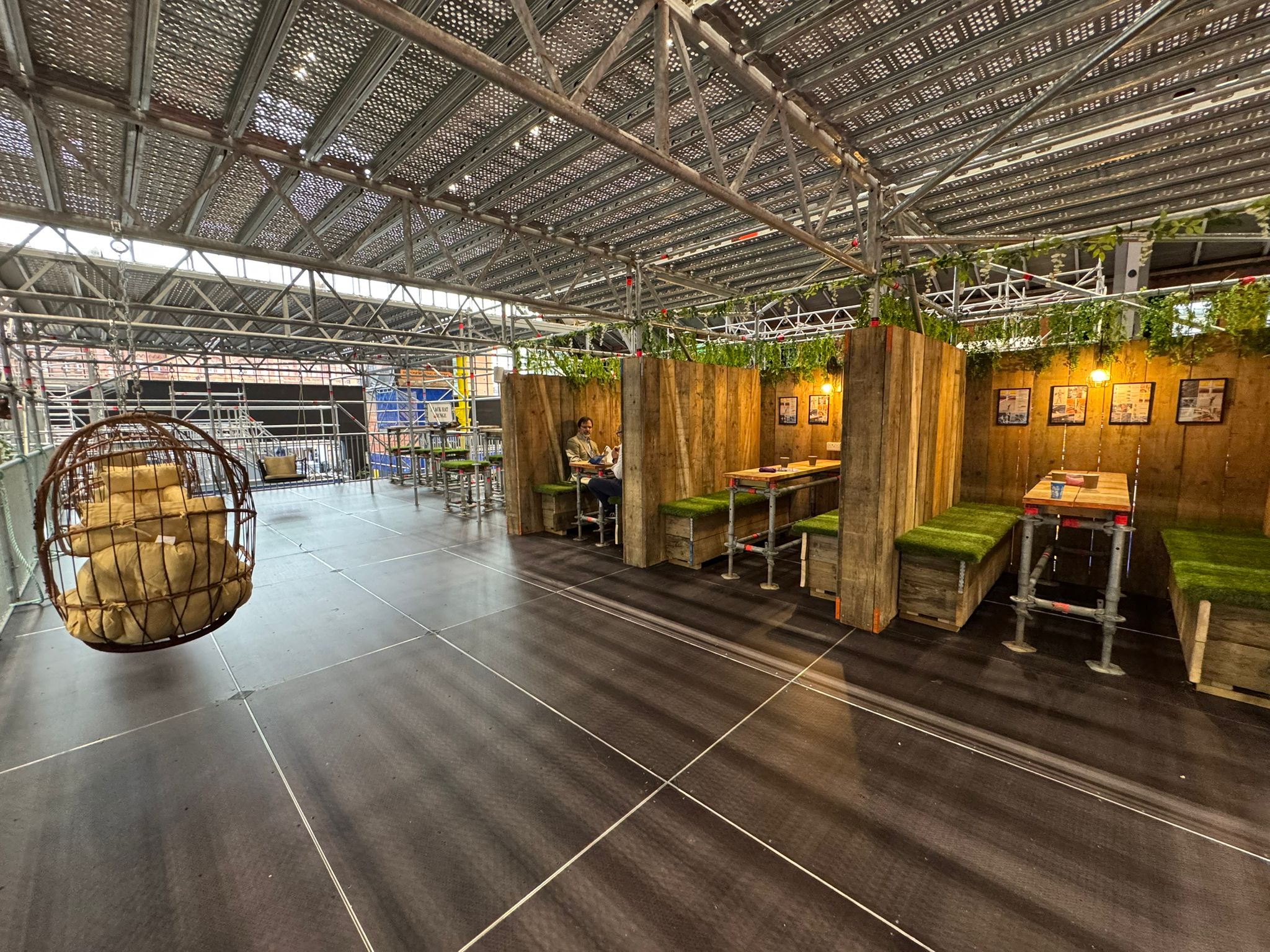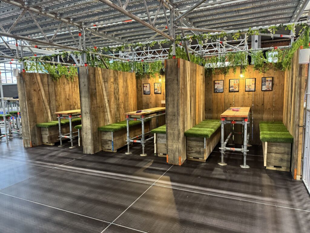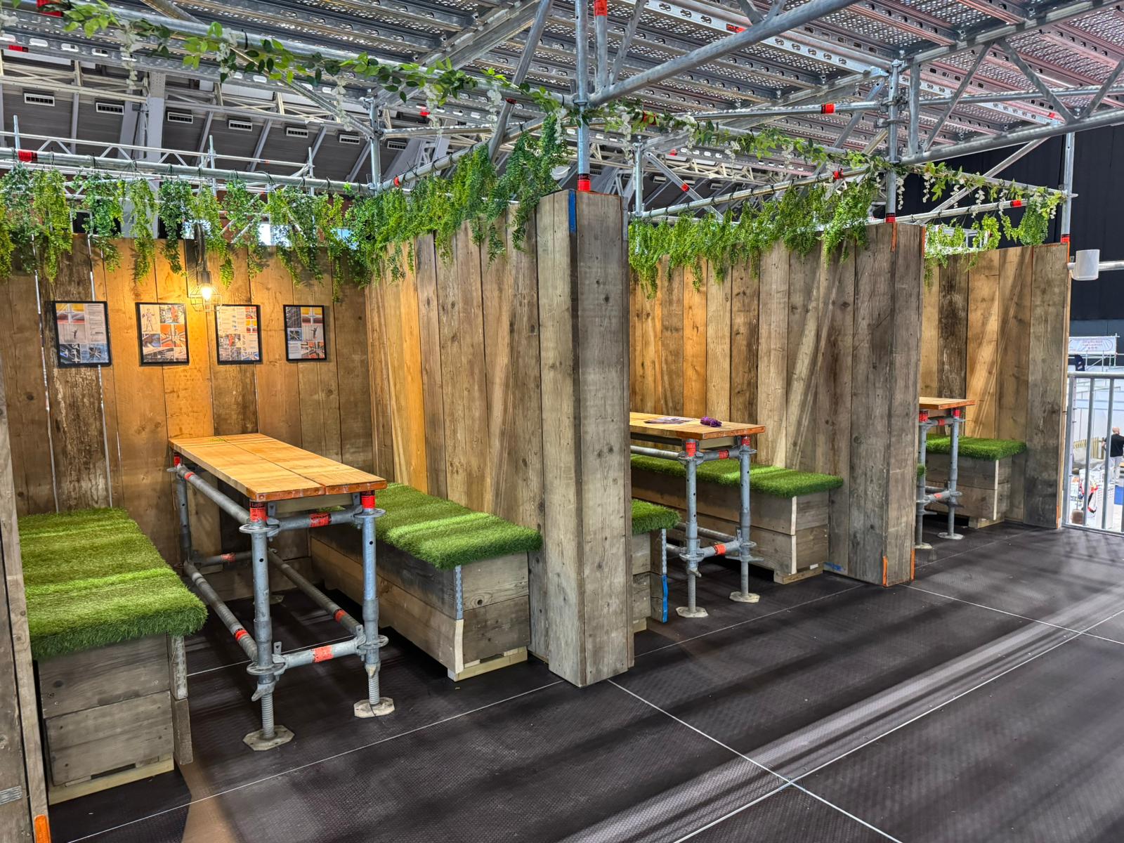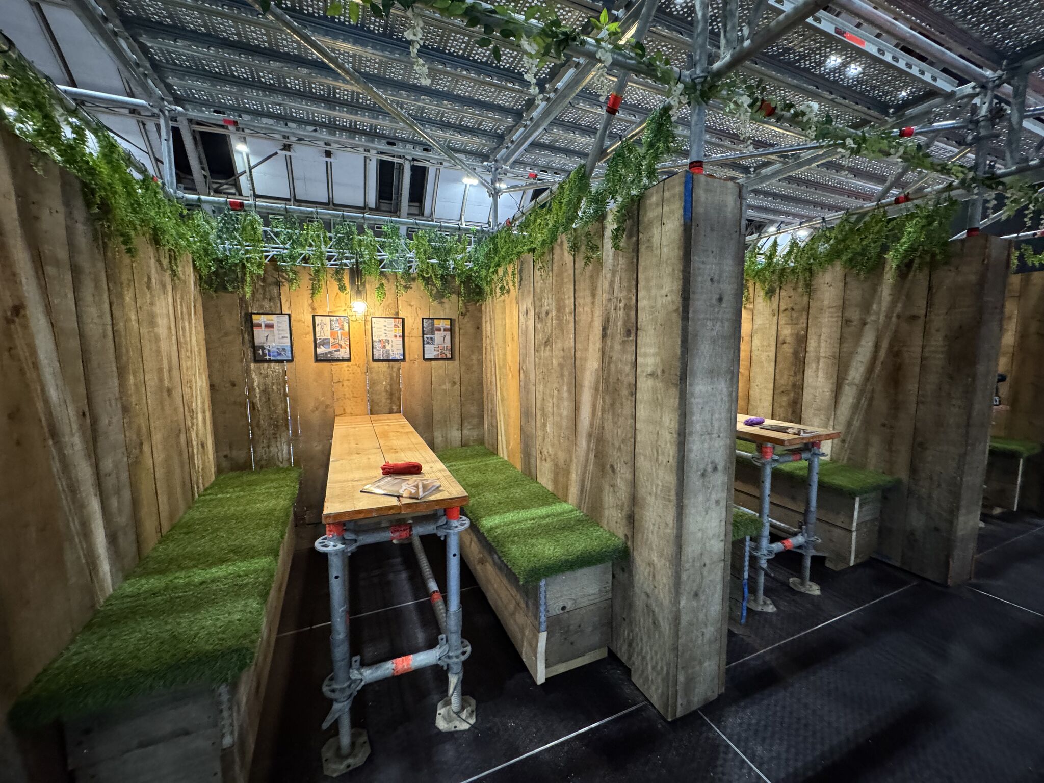 - Private booths and seating areas built from scaffold and timber, with turf-covered benches.