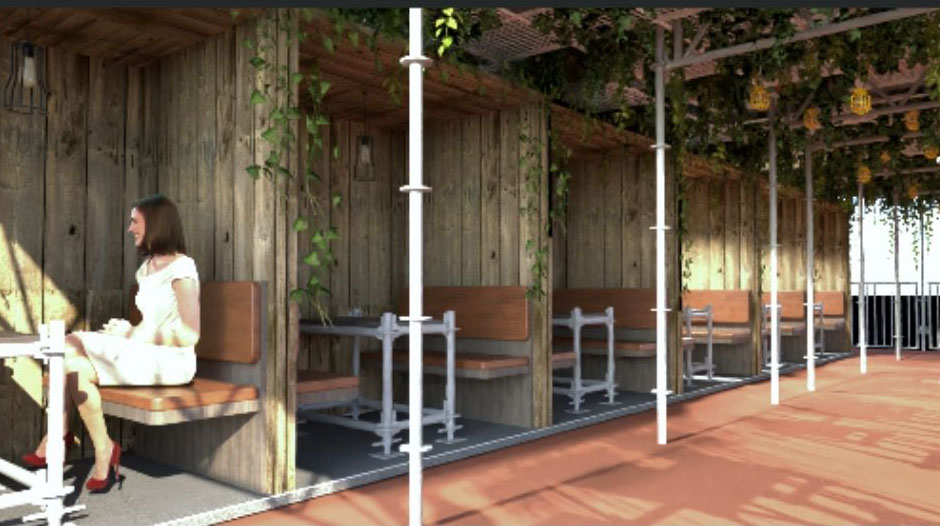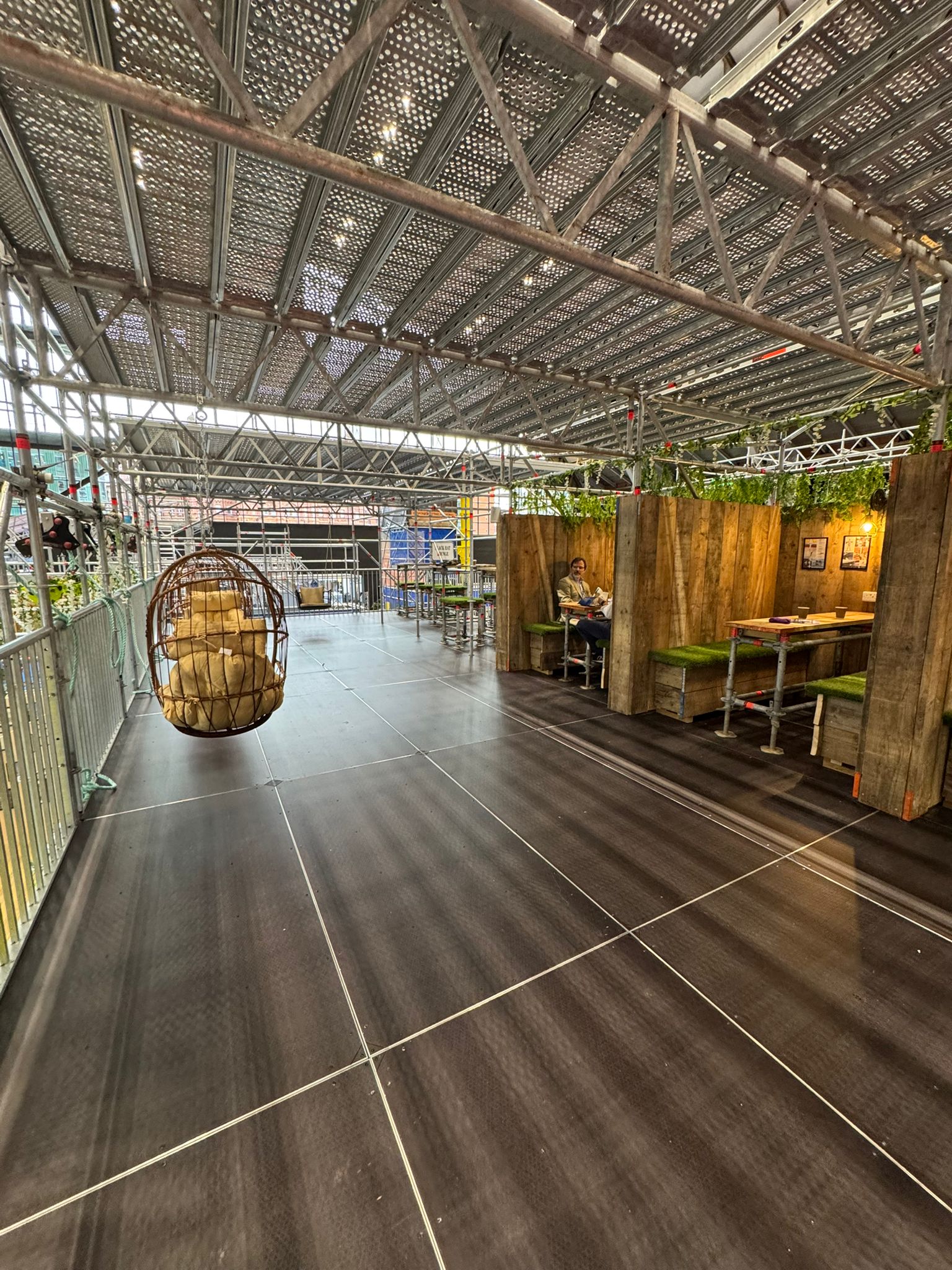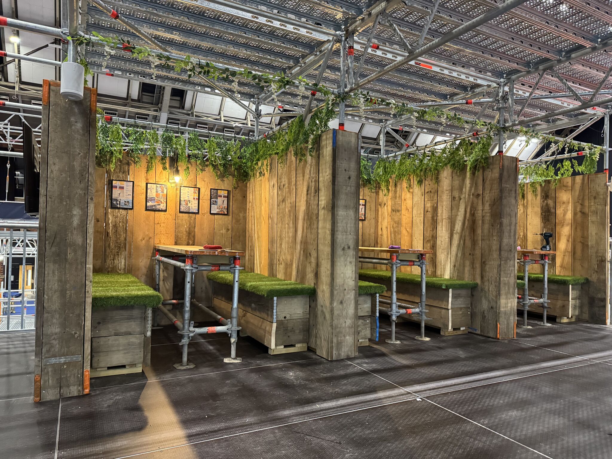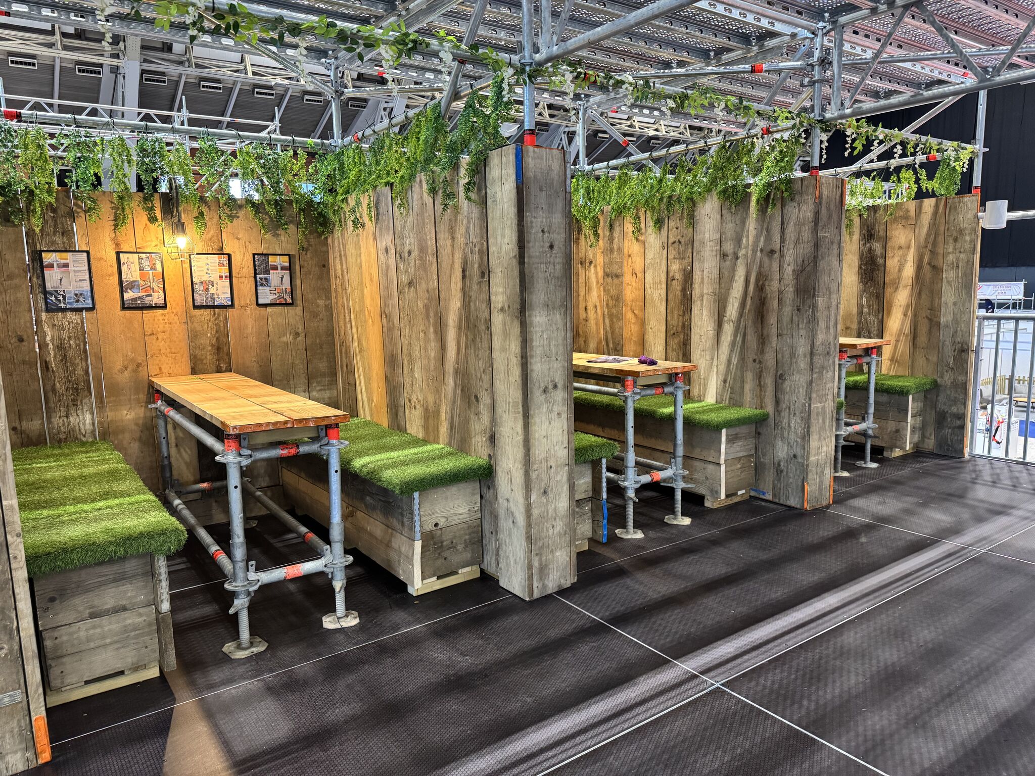- Private booths and seating areas built from scaffold and timber, with turf-covered benches.