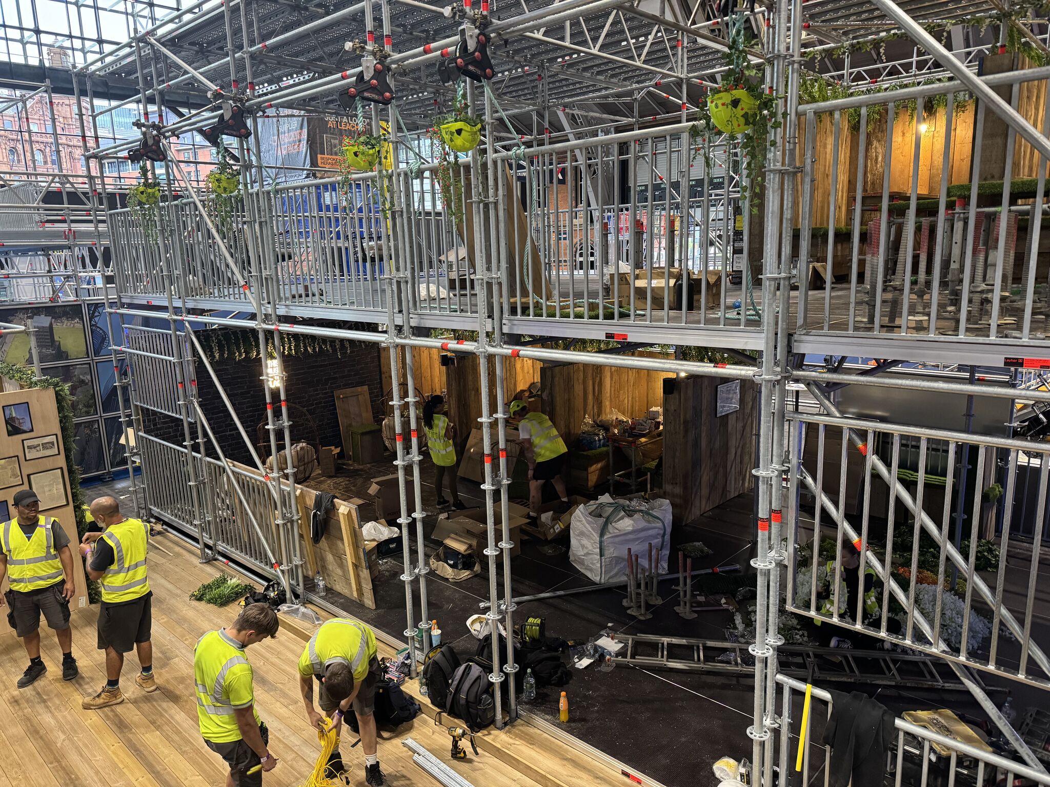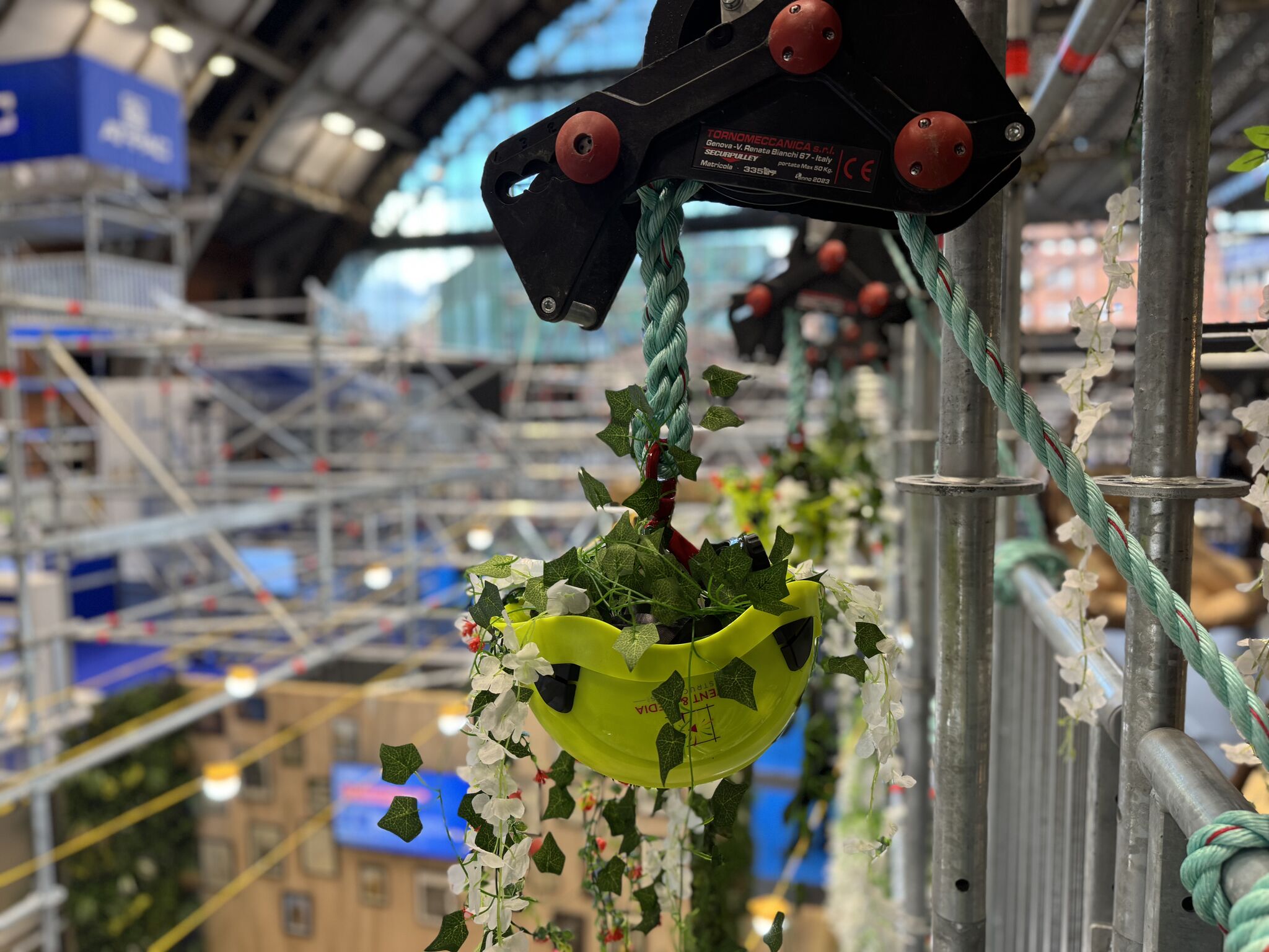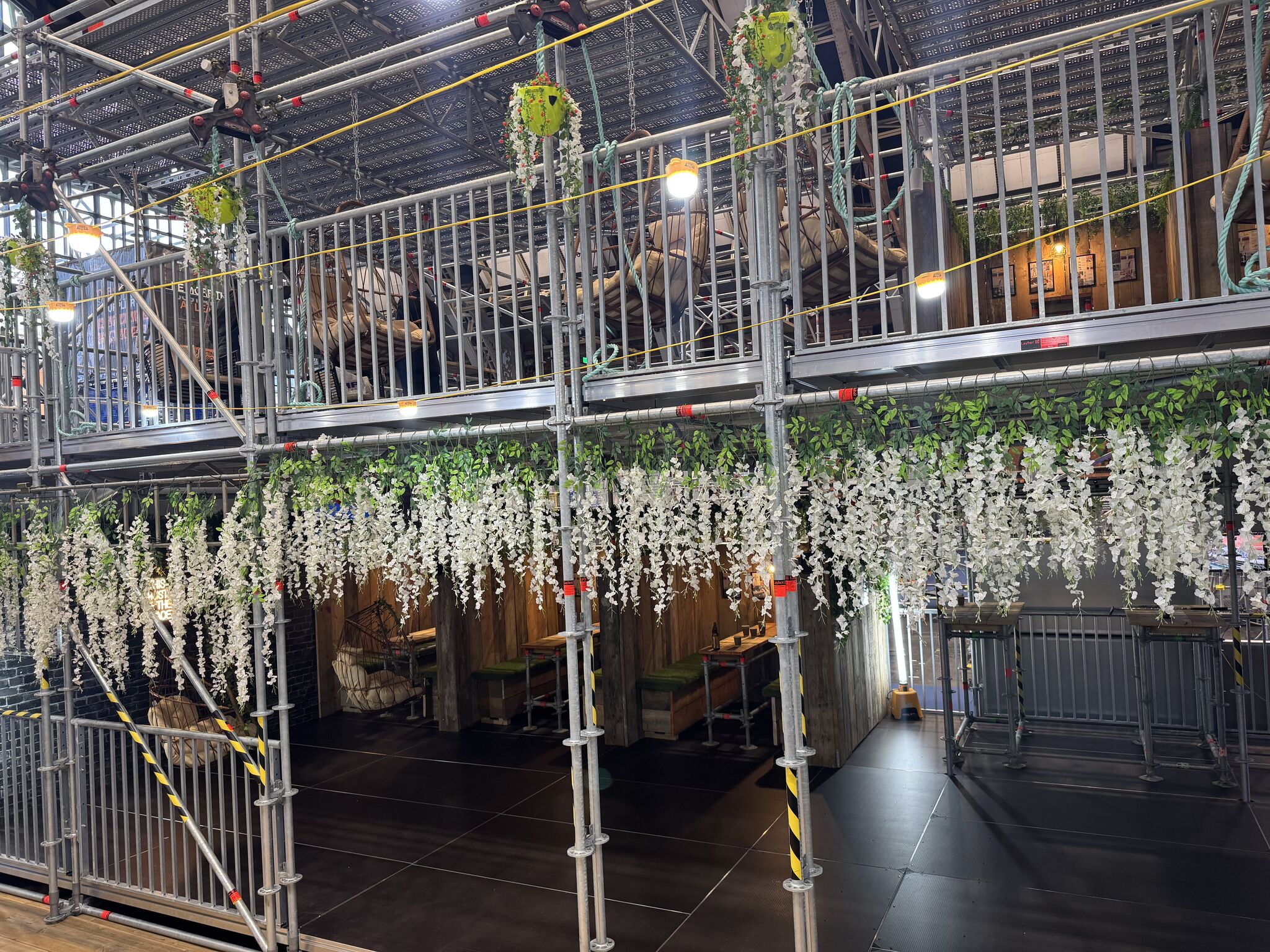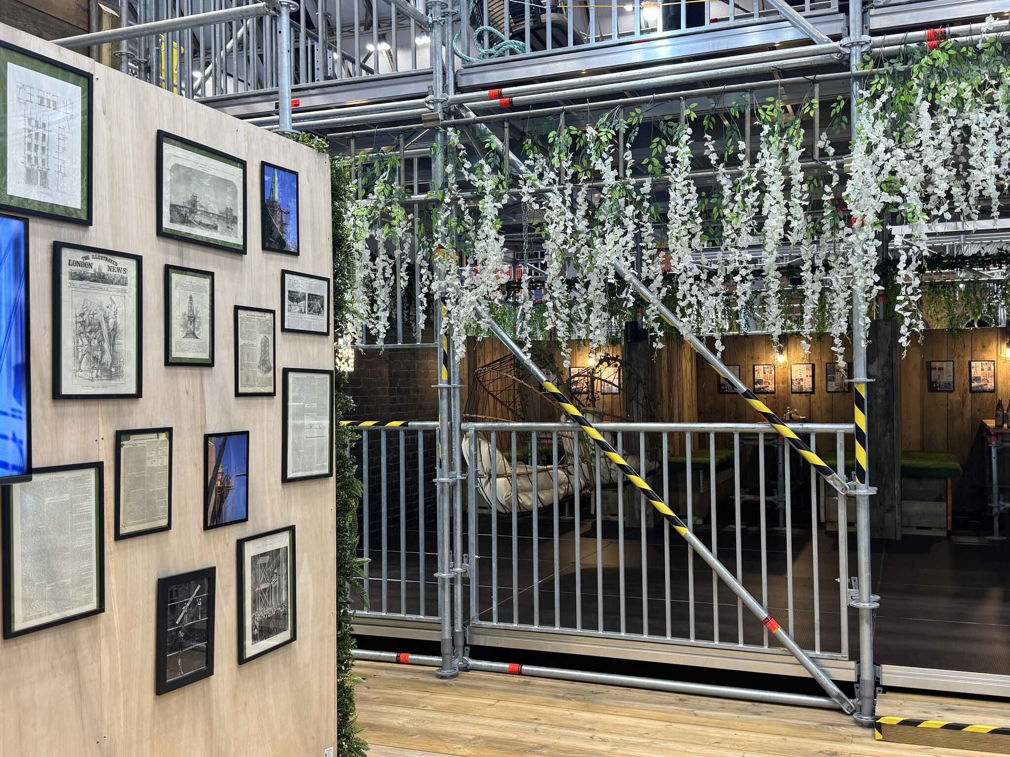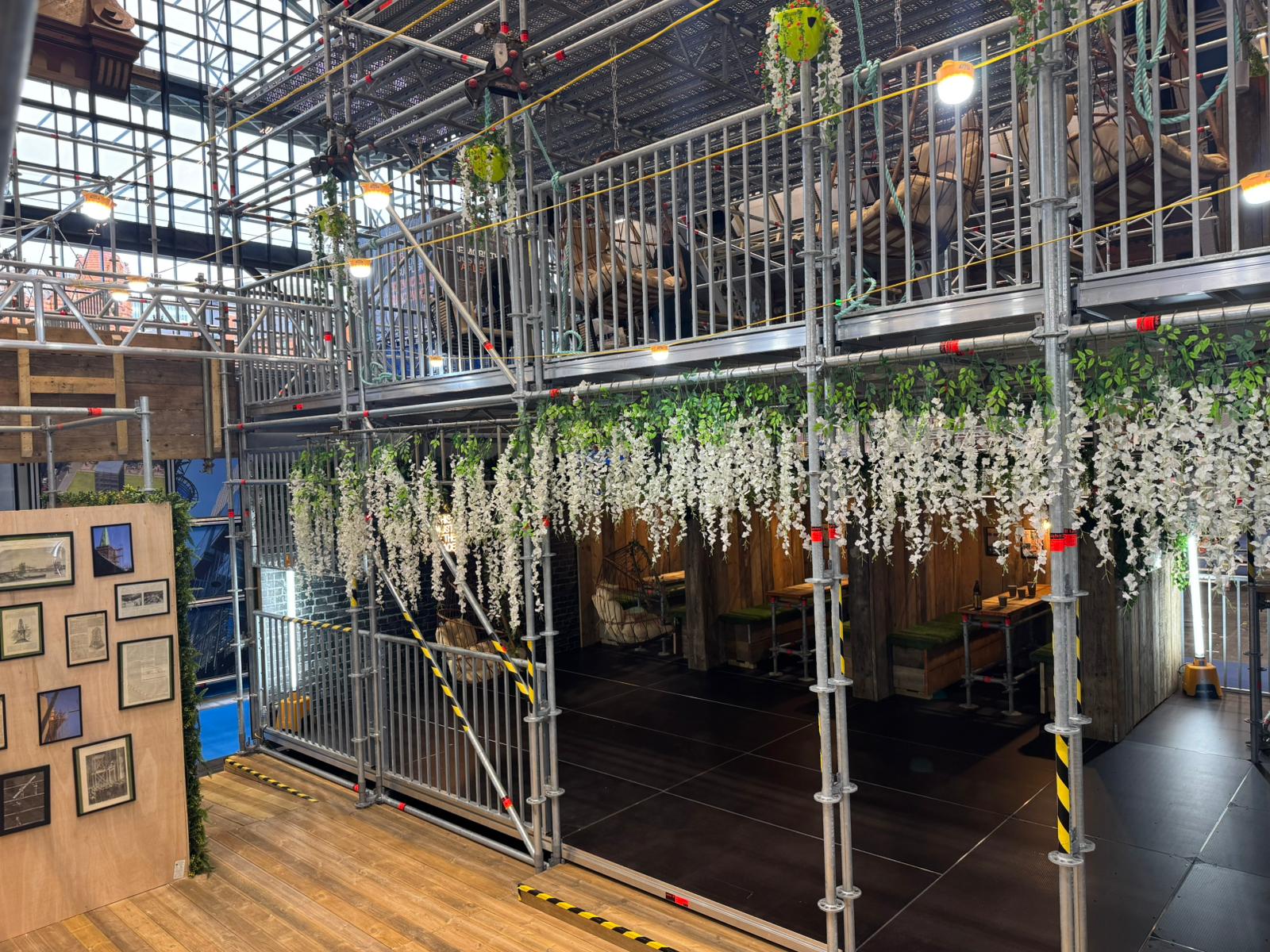 - Themed decoration including vintage scaffold artwork, rope pulleys, chute installations, and floral displays.