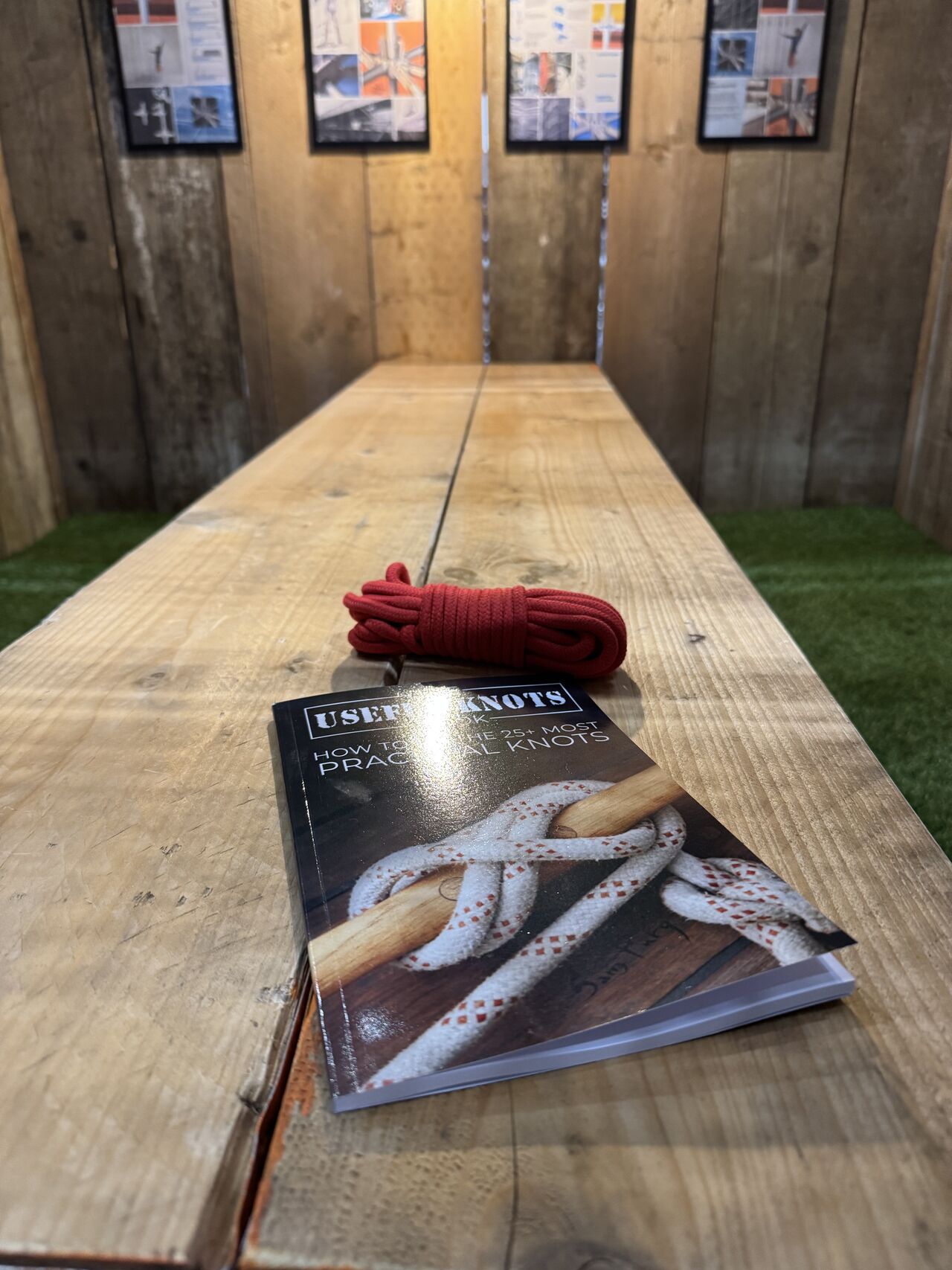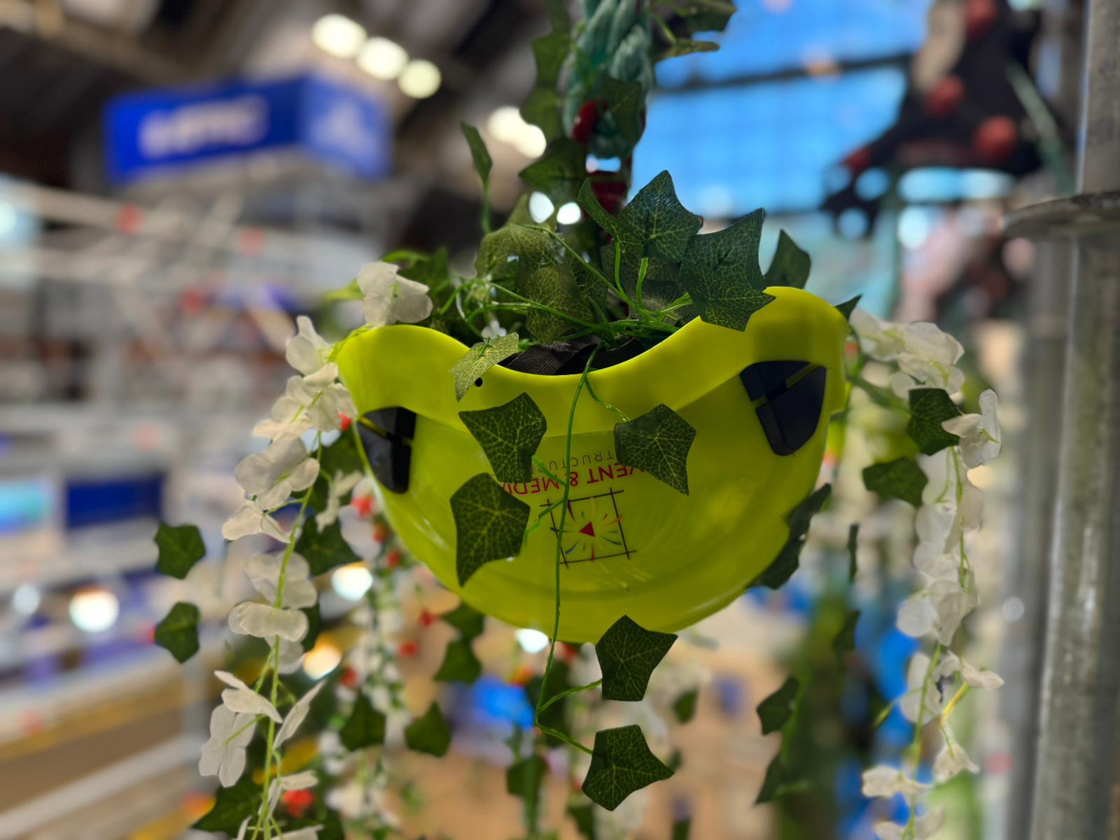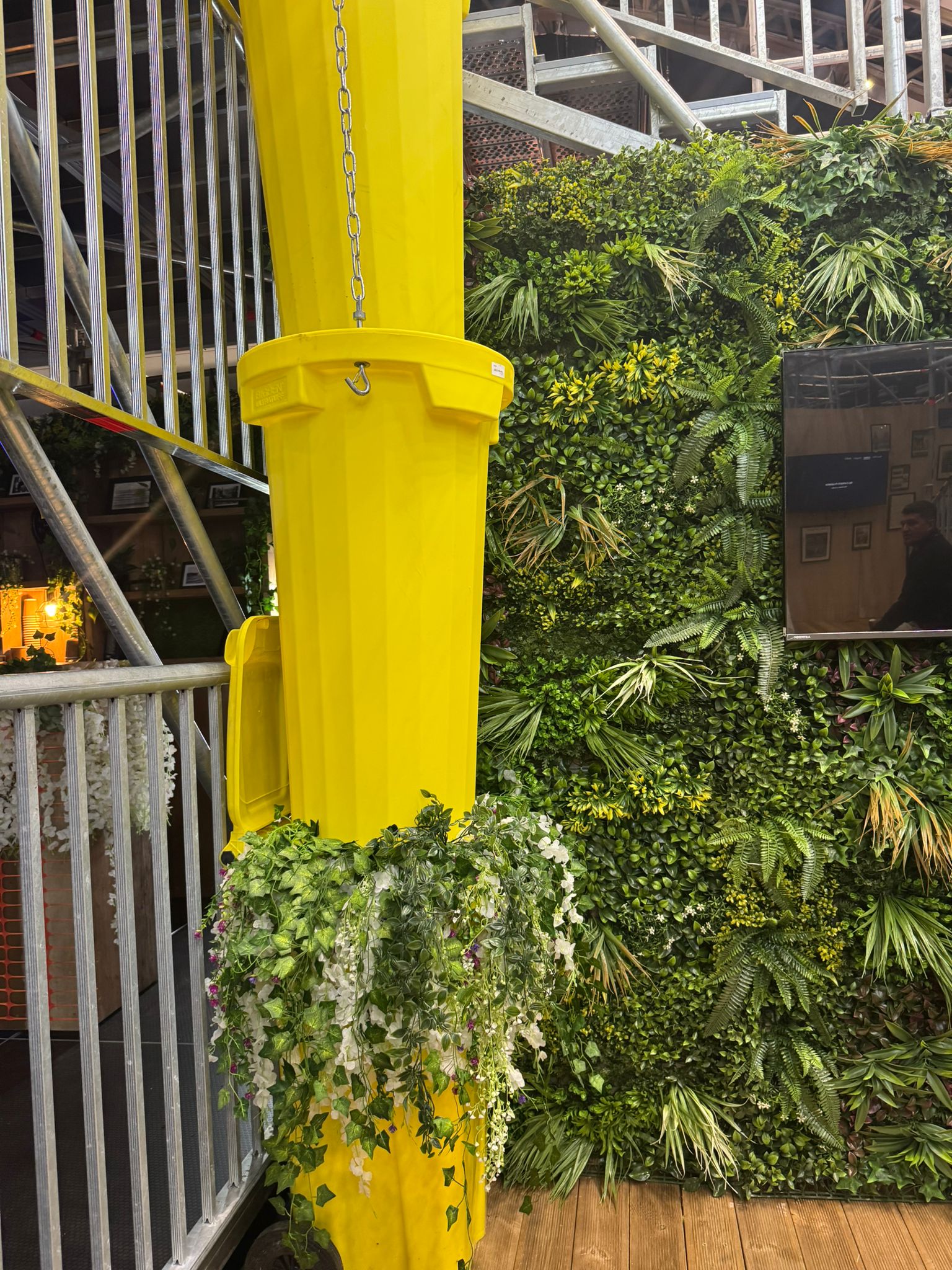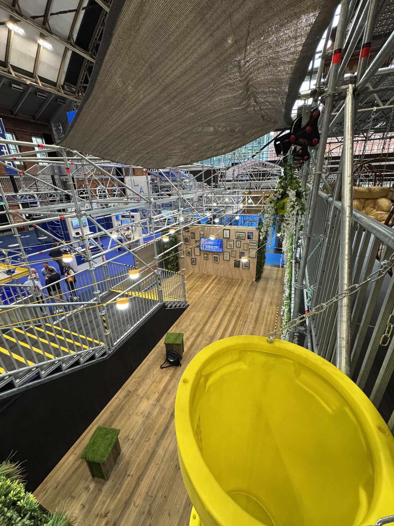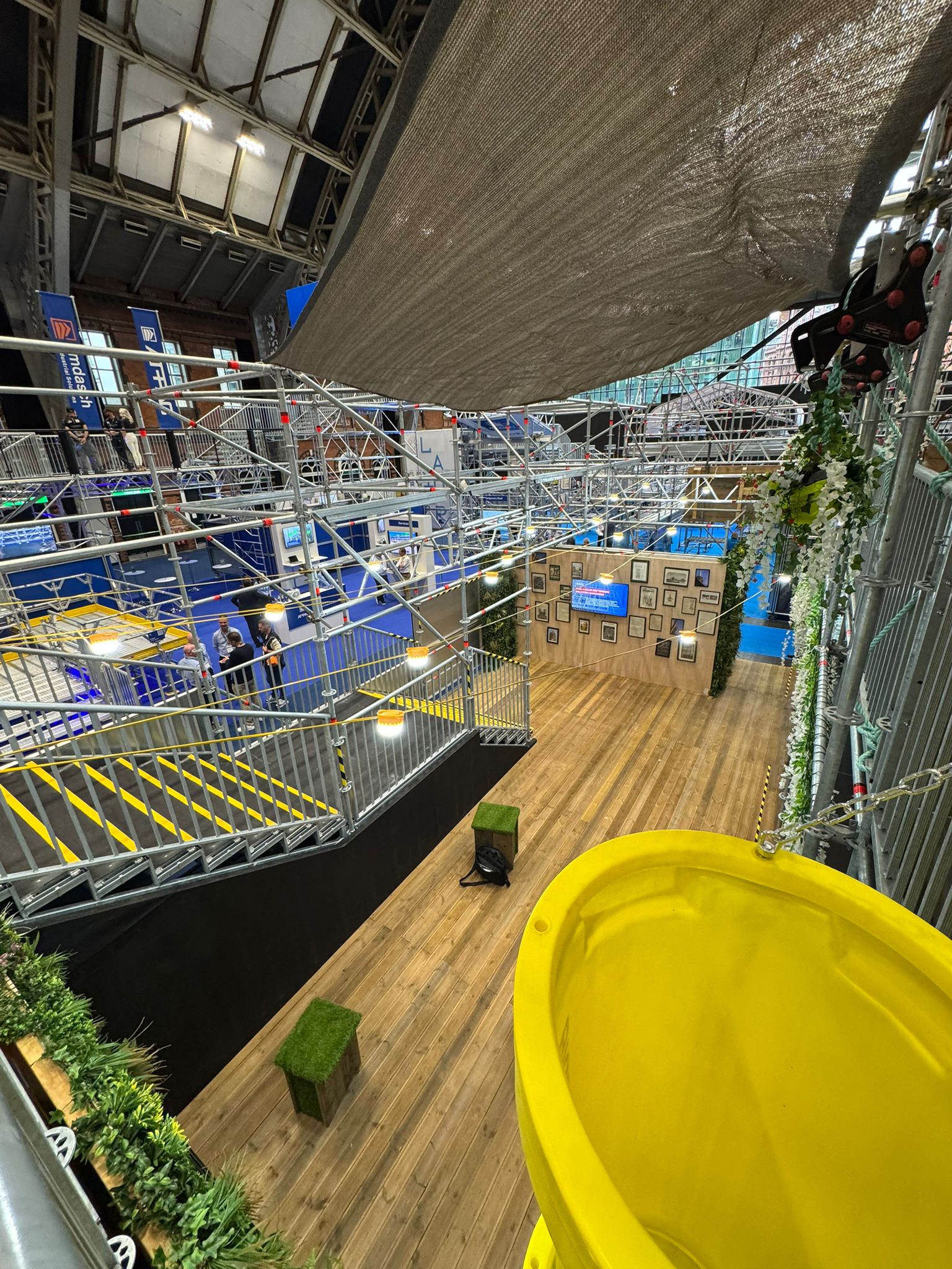 - Themed decoration including vintage scaffold artwork, rope pulleys, chute installations, and floral displays.