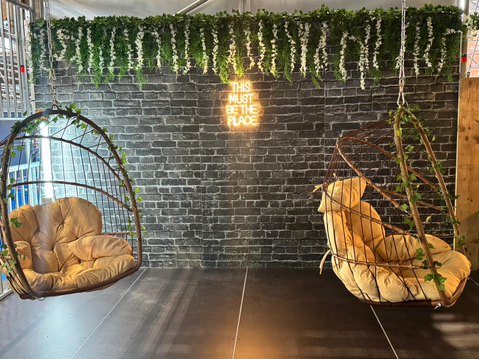 - Festoon lighting, screens, and bespoke signage, giving the lounge a warm, welcoming atmosphere.
